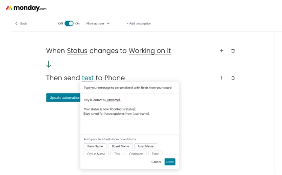 Once installed, you can use the SMS feature from an item card on monday.com. Simply open the item card, compose your message, and click send. The message will be sent instantly to your contact.